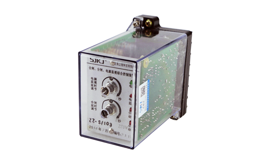 ZZ-S-25分闸、合闸、电源监视综合控制装置可连续监视断路器中的直流电源及整个跳闸回路。当直流电源消失、跳闸线圈及引线发生故障,继电器经0.3秒延时返回并通过它的触点发出报警信号。